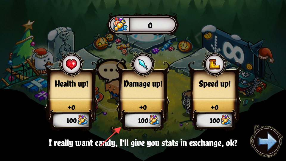 3、遭遇属性强化选项时,可以根据需要选择【Damageup!】等提升条目,消耗对应数量的糖果完成能力强化。