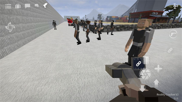 4、如果想切换持枪状态,点击右侧“手枪”图标即可;中间按钮为开火键,点击“+”可以添加靶子或敌人;
