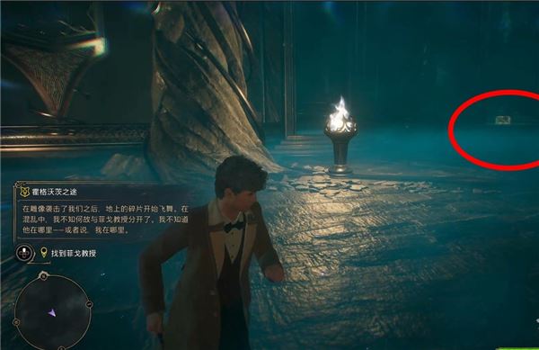 3、来到指定位置,爬上台子后向左走可找到一个【宝箱】,拾取后继续跟随菲戈教授;