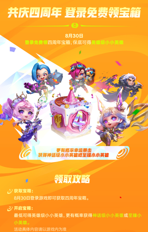 别犹豫,当天登录游戏就能免费领取四周年宝箱!宝箱最低能开出英雄级小小英雄,更有机会直接获得稀有的至臻小小英雄!每位弈士限领一次,千万不要错过这个“白嫖”机会。