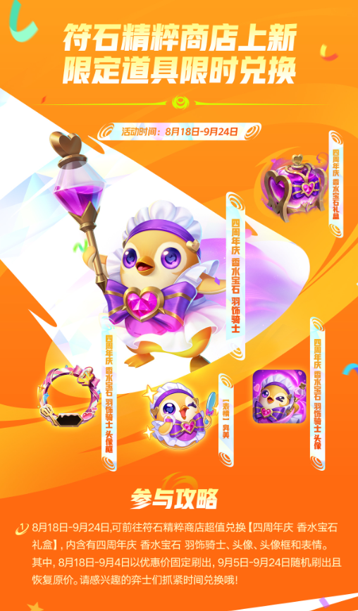同时,符石精粹商店也已上新限定道具,包括四周年庆香水宝石礼盒。8月18日-9月4日,礼盒将以优惠价固定刷新,之后将恢复原价并随机刷新。想要收集限定道具的弈士们要抓紧时间了!