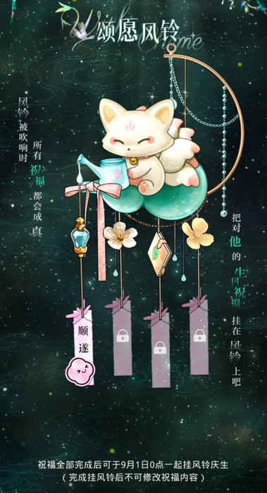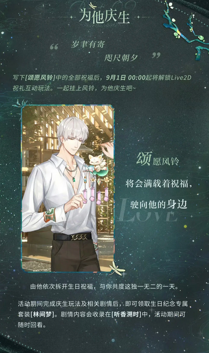 完成第一阶段的所有祝福后,9月1日00:00将解锁Live2D的庆生互动玩法。一起挂上风铃,为他庆祝生日吧!