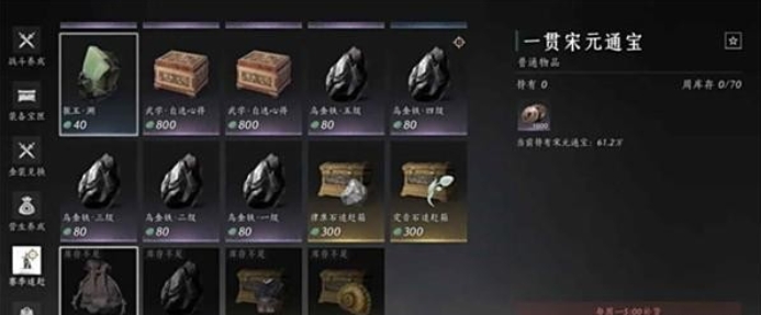 赛季追赶商店新增宋元兑换项目,每周可换7万通宝,建议将多余的活动货币优先投入,节庆或限时活动中常附带宋元奖励,目前单次活动最多可兑换5万通宝。