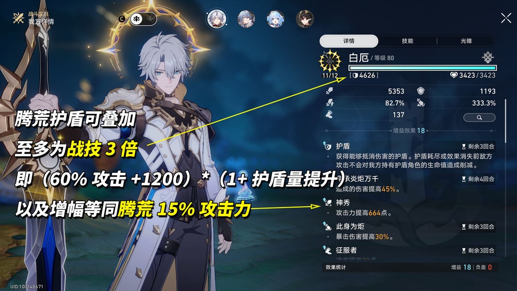 1.腾荒施放战技提供的群体护盾量可叠加,上限为单次战技护盾量的3倍,护盾量基于腾荒的攻击力,同时护盾为指定角色提供等同于腾荒15%攻击力的攻击力数值加成,因此若不想深究配速,直接一股脑堆叠攻击力,即可获得高盾量、高增伤的稳定收益。