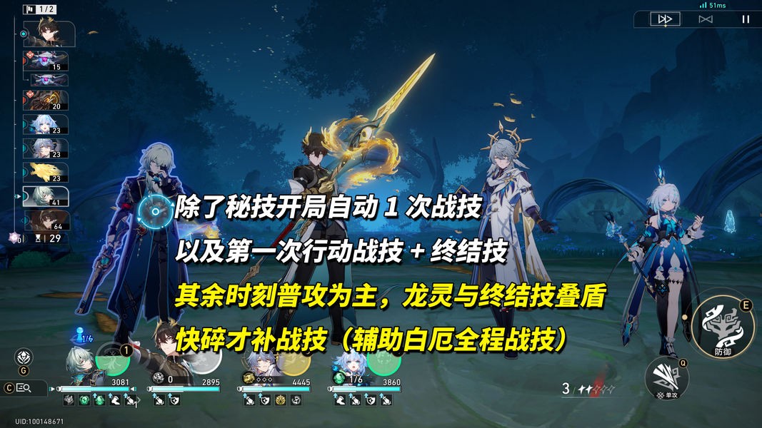 3.由于腾荒开局自带40%行动提前,加上龙灵高达165的基础速度,在常规流程中,往往是秘技自动战技+自身主动战技+龙灵首次行动,盾量在开局即可接近上限,后续行动以普攻产点为主,仅在护盾变薄时才补战技。