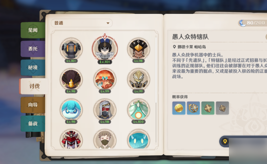 获取途径:这些材料由愚人众特辖队成员掉落。玩家可通过冒险之证中的讨伐任务进行追踪,进入菜单后选择冒险之证,点击“讨伐”分类下的“普通”标签,即可查看当前可挑战的目标位置。击败对应敌人后有几率掉落相应材料,建议结合日常清怪一并完成。