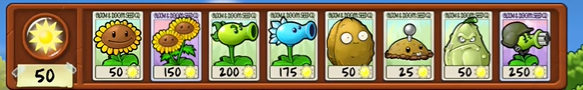 向日葵、双子向日葵、豌豆射手、寒冰射手、坚果、土豆地雷、窝瓜、机枪射手