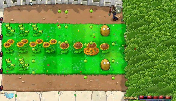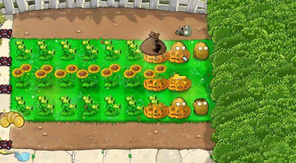 7、在第一波大军到来的时候,布局成坚果在前加南瓜罩保护,三发豌豆在后,向日葵在中的防御布局