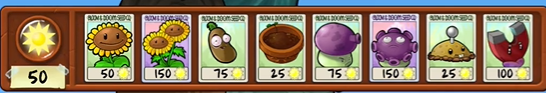 向日葵、双子向日葵、咖啡豆、花盆、大喷菇、忧郁菇、土豆地雷、磁力菇