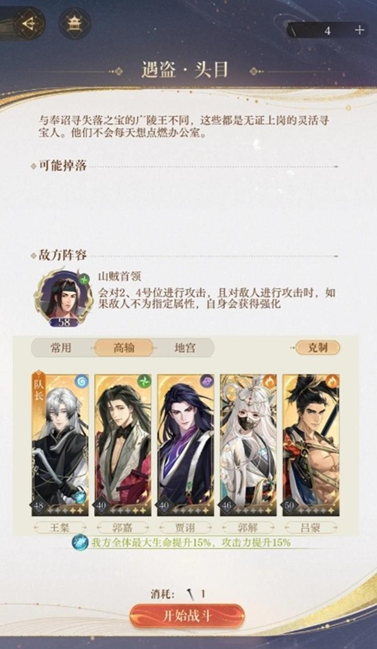 2.首先进入匣椟选择挑战后,玩家会被传送到Boss山贼首领的场景。这一关卡中有两个主要Boss,它们分别固定攻击2号位和4号位。红衣首领对敌方4号位造成300%攻击力的伤害,如果无法选中4号位则会选择顺序下一位目标。他的普通攻击对4号位造成100%攻击力伤害,同样在无法选中时会转移目标。红衣首领的天赋是在攻击非地属性敌人时获得3层狂热,受到非地属性攻击时获得1层狂热,受到地属性攻击时减少2层狂热。狂热状态能够提升10%攻击力,效果可叠加。