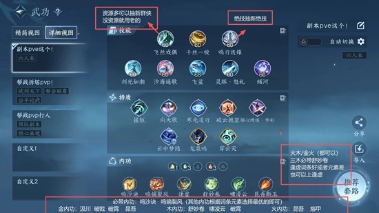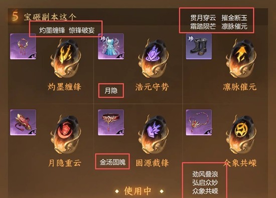 5.内功:核心必带内功:鸣沙诀、鸣镝裂风(其余内功可根据词条属性及元素适配性挑选最优组合)金系内功:汲川、破戟、破霄、昆吾木系内功:舒妙卷、啸凌云、破霄火系内功:昆吾、熔甲属性组合采用金火或火木均可,若选择三木组合,舒妙卷为必带;若逢虚词条优质或元素适配度欠佳,也可搭配逢虚