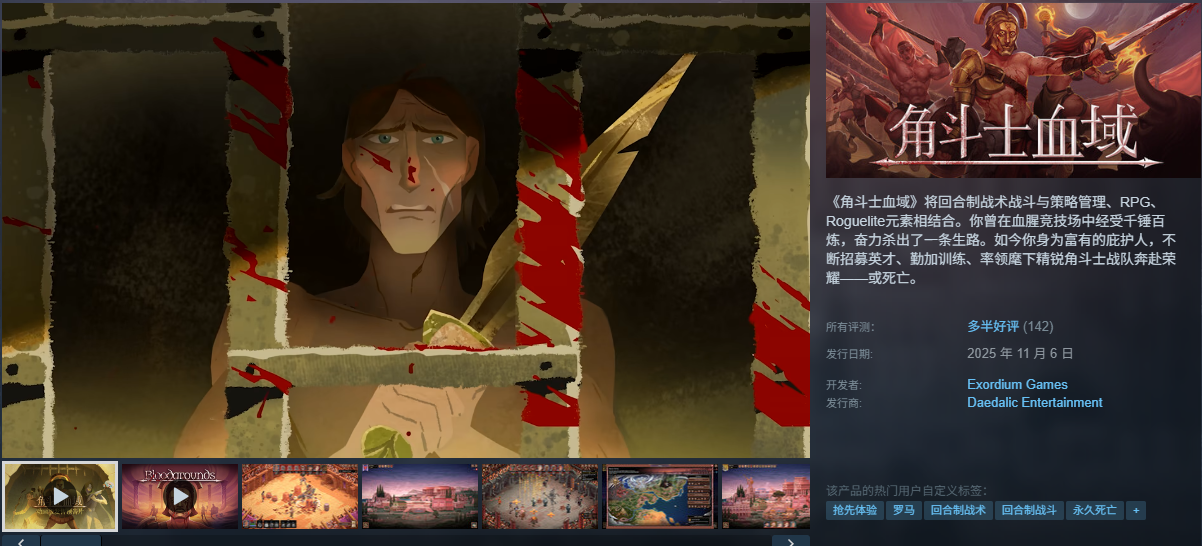 角斗士血域(Bloodgrounds)是一款融合回合制战术、策略管理与RPG元素的硬核游戏,玩家扮演复仇的角斗士赞助人,指挥由近战、远程、魔法战士组成的队伍在网格化竞技场上厮杀,每一场战斗都是生死抉择,角斗士阵亡将永久消失。游戏目前已经在steam平台上上架了先行版,让玩家可以进行抢先体验,游戏的完整版估计会在2026年年初上线。