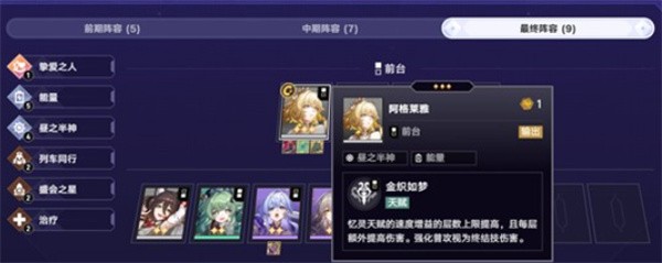 该流派围绕核心角色阿格莱雅展开,通过堆叠速度将其转化为伤害,形成高频出手的持续压制,利用反重力鞋等装备大幅叠加速度属性,依靠阿雅的技能机制实现极高频出手,打乱敌方节奏,通过频繁释放终结技,形成强大的大招循环。