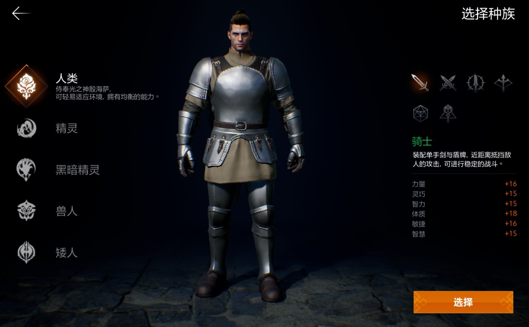 1.人类骑士:防御顶尖,持单手剑+盾,有嘲讽和击退技能,前排坦克定位。人类属性均衡,主加力量、辅加体质即可兼顾生存输出,野外挂机、副本适配性强,战盟、攻城战刚需,新人易组队。
