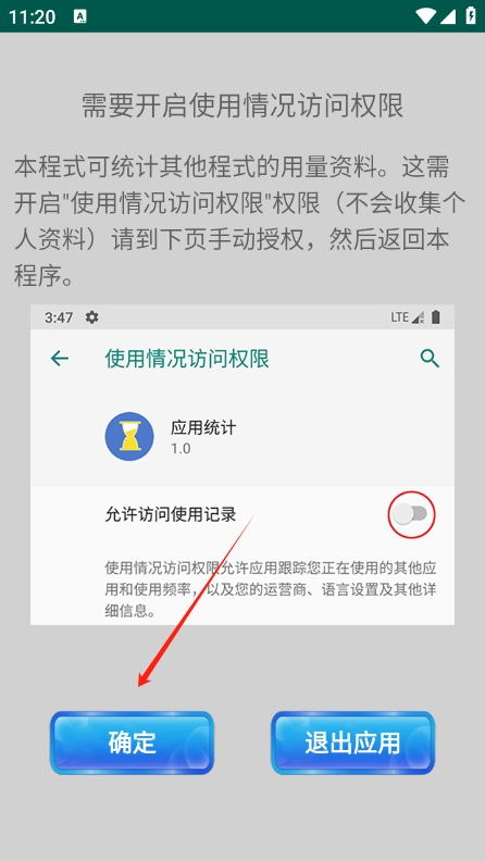 2、首次使用时,需要在系统权限中开启 “应用使用记录” 功能,确保统计功能正常运行;